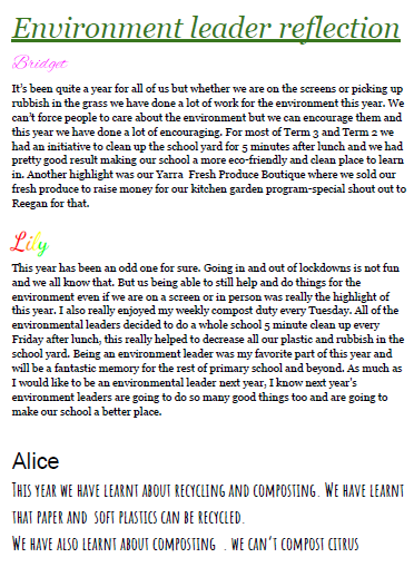 A rollercoaster of events and emotions have been with us this year. But this year, our school has been able to achieve a lot of things again even in covid times. We have done virtual assemblies in lockdowns and when the restrictions wouldn’t let us to do live assemblies, which was a success and now we’re back to doing live assemblies, and we get to see everyone again! We have put our ideas to make the school better for the future of Yarra. We have also put a lot more student voices in Yarra, it has helped all the students think about what the future of Yarra should look like and feel like.